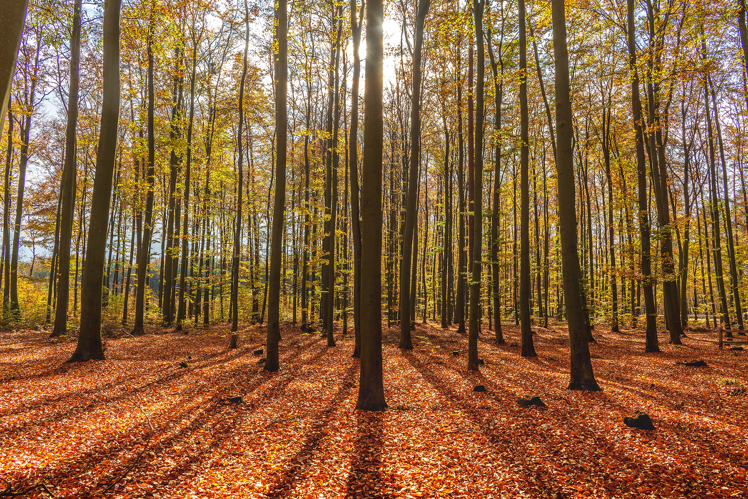 Previous Image Next Image Thick deciduous forest in autumn. Translucent sun rays gently fall on the trunks of trees.